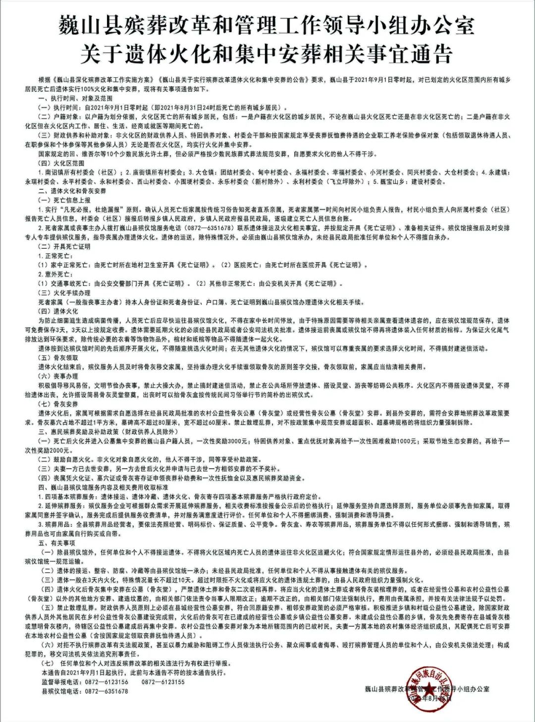 根据《巍山县深化殡葬改革工作实施方案》《巍山县关于实行殡葬改革遗体火化和集中安葬的公告》要求,巍山县于2021年9月1日零时起,对已划定的火化区范围内所有城乡居民死亡后遗体实行100%火化和集中安葬,现将有关事项通告如下。